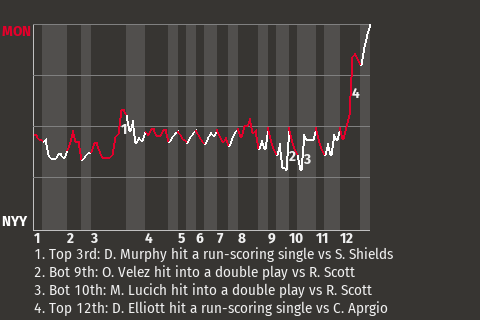 The game was at a stalemate until second baseman Donald Elliott came to bat in the top of the 12th. Facing New York pitcher Camilo Aprgio, he hit a 1-2 screwball for a run-scoring single. It was a game-changer, putting Montreal on top, 3-2.