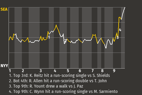 Seattle used the timely hitting of Chris Wynn to seize the win. The designated hitter stroked a run-scoring single in the top of the ninth inning to put the Mariners on top, 3-2. It was his only hit in 5 at-bats, but it was a game-changer.