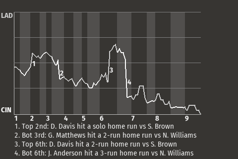 In the bottom of the sixth, Cincinnati second baseman Jim Anderson put his team on top. With one out and runners on 1st and 2nd, he hit his 6th home run of the year. Los Angeles pitcher Nick Williams served it up. Just like that, the Reds were ahead, 5-3.