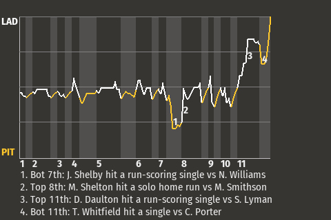 Williams was effective for Los Angeles, seldom allowing the Pirates to square up a pitch. The right-hander tossed 100 pitches over 8 innings. He limited Pittsburgh to just 1 run on 3 hits.