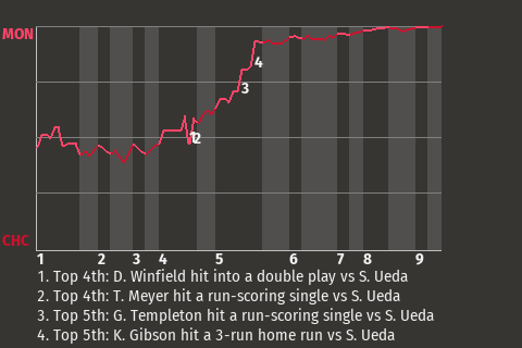 Kirk Gibson, the 1980 Rookie of the Year Award winner , had a direct impact on the outcome. Gibson contributed a 3-run home run in the top of the fifth inning to put Montreal up, 5-0.